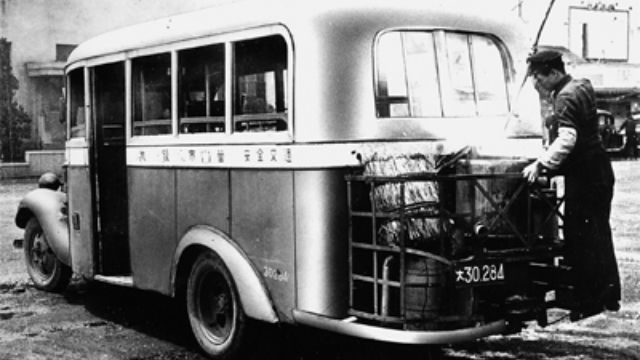 大正から昭和にかけて興隆期を迎えたバス事業は、日中戦争の勃発以降、苦難の時代へと突入して行きます。燃料事情の悪化とともに、木炭や薪などの代用燃料車への転換を余儀なくされ、太平洋戦争を経て昭和24年頃までは、燃料の確保が業界の最重要課題となっていました。