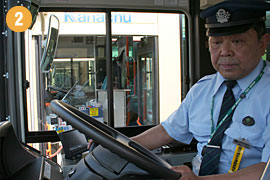 - 連節バス「ツインライナー」に乗務する亀山さん