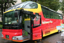 お陰さまで、かなりのご評判をいただいております。横浜から広島まで、毎日、2台で運行しています。バスの中で、ゆっくりくつろいでもらうために、オリジナルのスリッパなどの、アメニティグッズも用意しています。