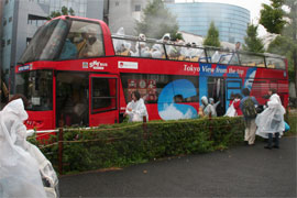 「幌の上部は透明になっていて、雨の日でも外の眺めが見えるようになっていますが、視界が狭まるのを嫌がるお客さまも多く、オープンバスを目当てにいらっしゃるので、カッパを着て乗車されるお客さまもいらっしゃいます」ということです。