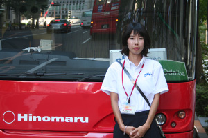 「スカイ ホップ バス」のアシスタントとして活躍中の辛嶋さん。土・日は、お客様も多く、いつも大変な賑わいだそうです。