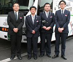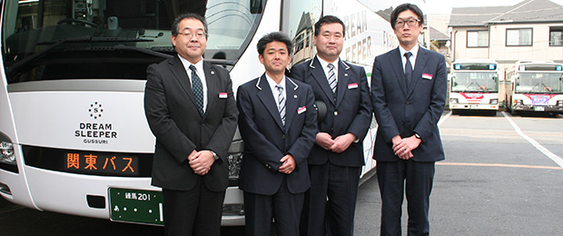 写真は左から、関東バス・経営管理室長の久永さん、同社丸山営業所・副所長の石場さん、同営業所・所長の秋葉さん、経営管理室主任の大田さん。