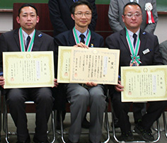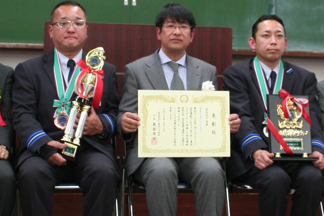 写真は、中央が個人総合優勝の小松さん(東京空港交通)、左が同準優勝の町井さん(平成エンタープライズ)、右が同3位の田中さん(平成エンタープライズ)。