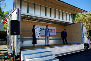 いつも好評の体験型バスイベント「バステクin首都圏」は今回が4回目の開催になります。朝10時から夕方4時までの開催でしたが、朝から多くの人々が会場を訪れていました。メインのプレゼンステージは、午前の部が10時30分から、午後の部が13時30分からスタート。出展している各社の人たちが順番にステージに上り、見どころなどをアピールしました。