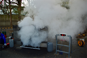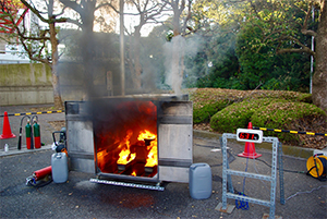 プレゼンステージの横では、株式会社ニチボウによる、エンジンルーム自動消火装置の実演が行われました。万一のエンジンルームの火災、電池火災、燃料火災など、あらゆる火災を急速消火する電源不要の「ウォーターミスト消火システム」を紹介。迫力のある炎と瞬時に消火される様子を目の当たりにし、多くの人の感心する表情が見られました。
