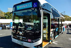 第1会場では、東京都交通局の燃料電池バス、トヨタ「SORA」も展示されました。東京都交通局では2017年3月から、市販車では日本初となる燃料電池バスの運行を開始。燃料となる水素を車載の高圧タンクから燃料電池に供給し、そこで空気中の酸素と化学反応させて作った電気でモーターを駆動させ走行させています。また、燃料電池バスは災害時の電力供給にも貢献することができます。