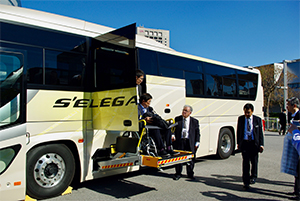 道を隔てた第2会場にも多くのバスが集結。その勇姿が集まった人の目を楽しませていました。そうした中で、日野自動車の「セレガ」のリフト付きタイプも展示され、車いすの利用者による実演も行われていました。