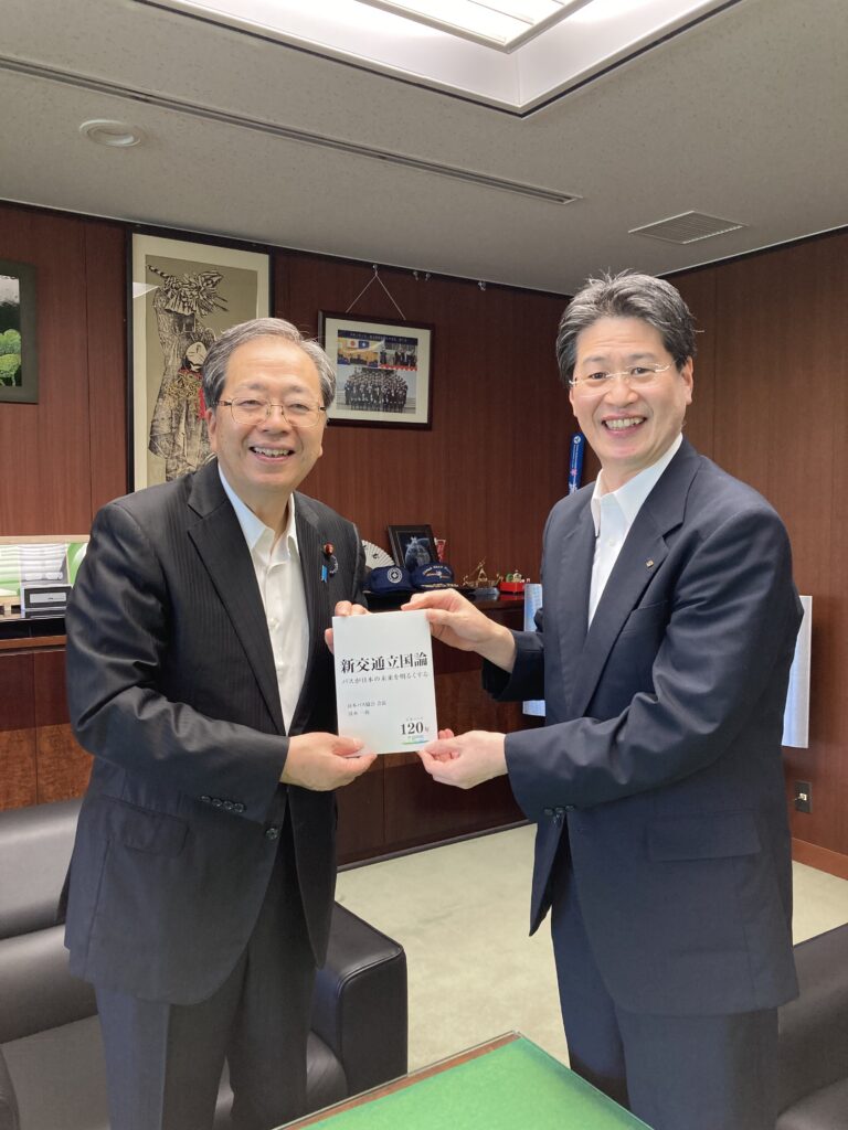 2023.09.13 協会ニュース 清水会長が斉藤鉄夫国土交通大臣を訪問しました 9月13日(水)、清水会長が斉藤鉄夫国土交通大臣を訪問しました。 日本のバスが120年を迎えて、これからの公共交通の処方箋を清水会長自身が書き下ろした書籍「新交通立国論」を謹呈し、意見交換しました。 ニュース一覧に戻る