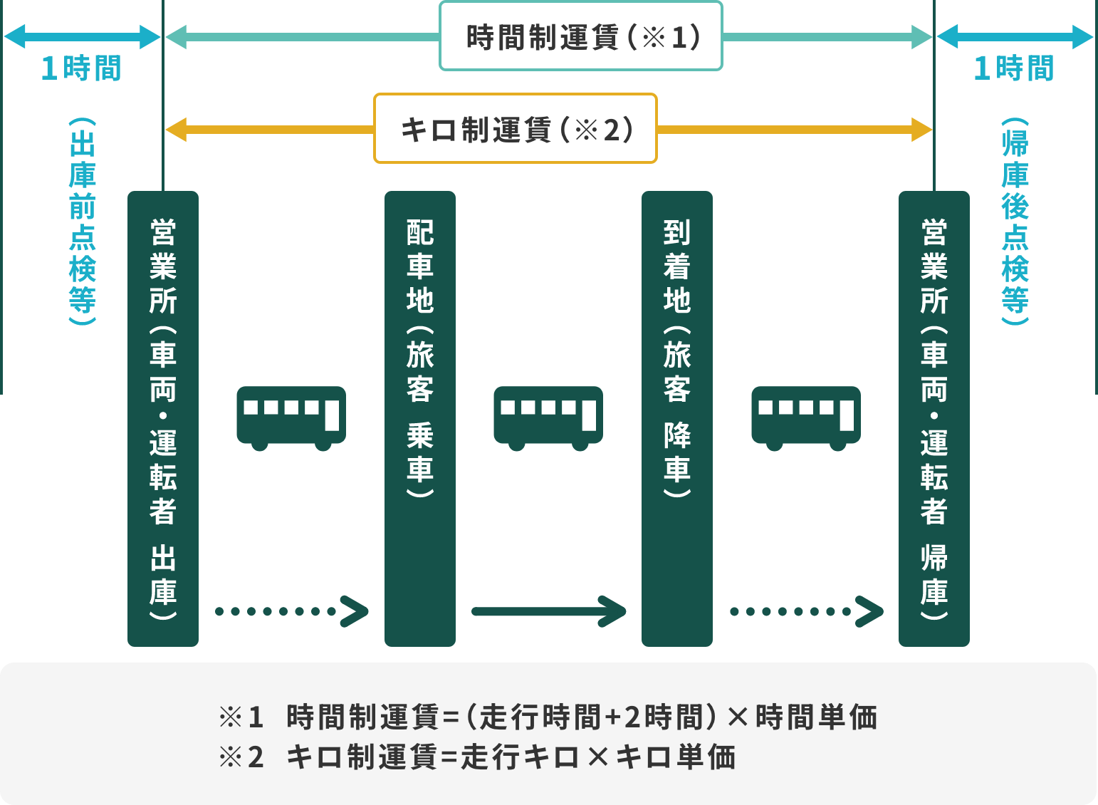 運行開始(出庫)から運行終了(帰庫)までの走行距離に、1キロあたりの運賃を乗じた「キロ制運賃」と、運行開始から運行終了までの時間に運行前、運行後に行う点検・点呼等に要する時間(2時間)を加えた時間に、時間あたりの運賃を乗じた「時間制運賃」とを合計した額が運賃となります。